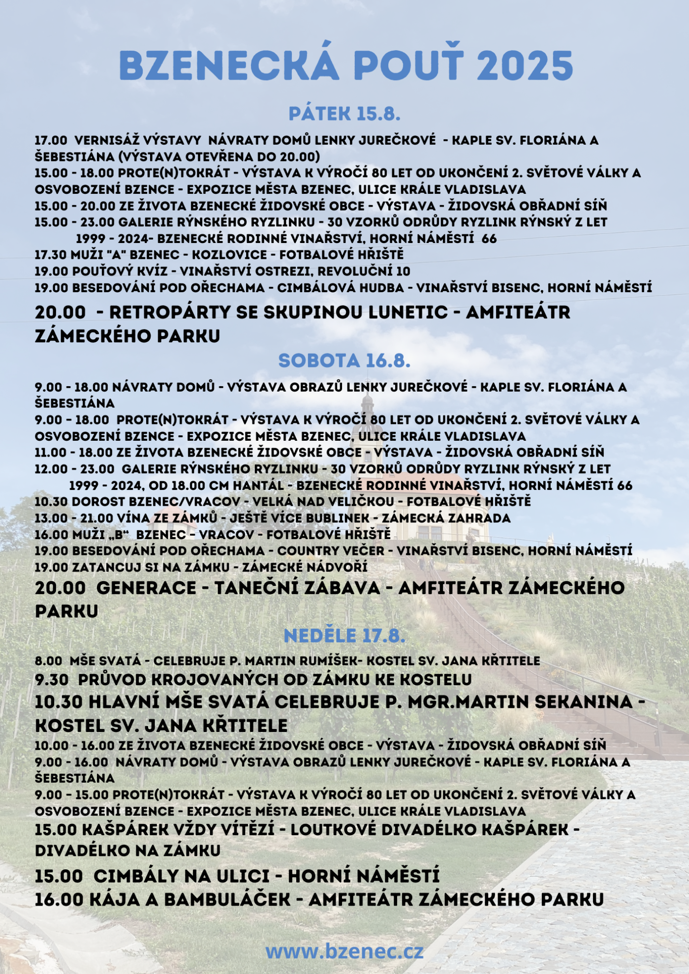 15:00 - 18:00 Prote(n)tokrát - výstava k výročí 80 let od ukončení 2. světové války a osvobození Bzence (expozice města Bzenec, ul. Krále Vladislava),