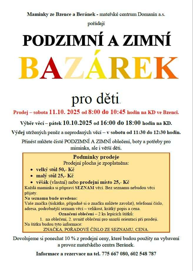 Přinést můžete čisté PODZIMNÍ A ZIMNÍ oblečení, boty a potřeby pro miminka, ale i větší děti. Dovolujeme si ponechat 10 % z prodejní ceny, které budou použity na vybavení a provoz mateřského centra Beránek.