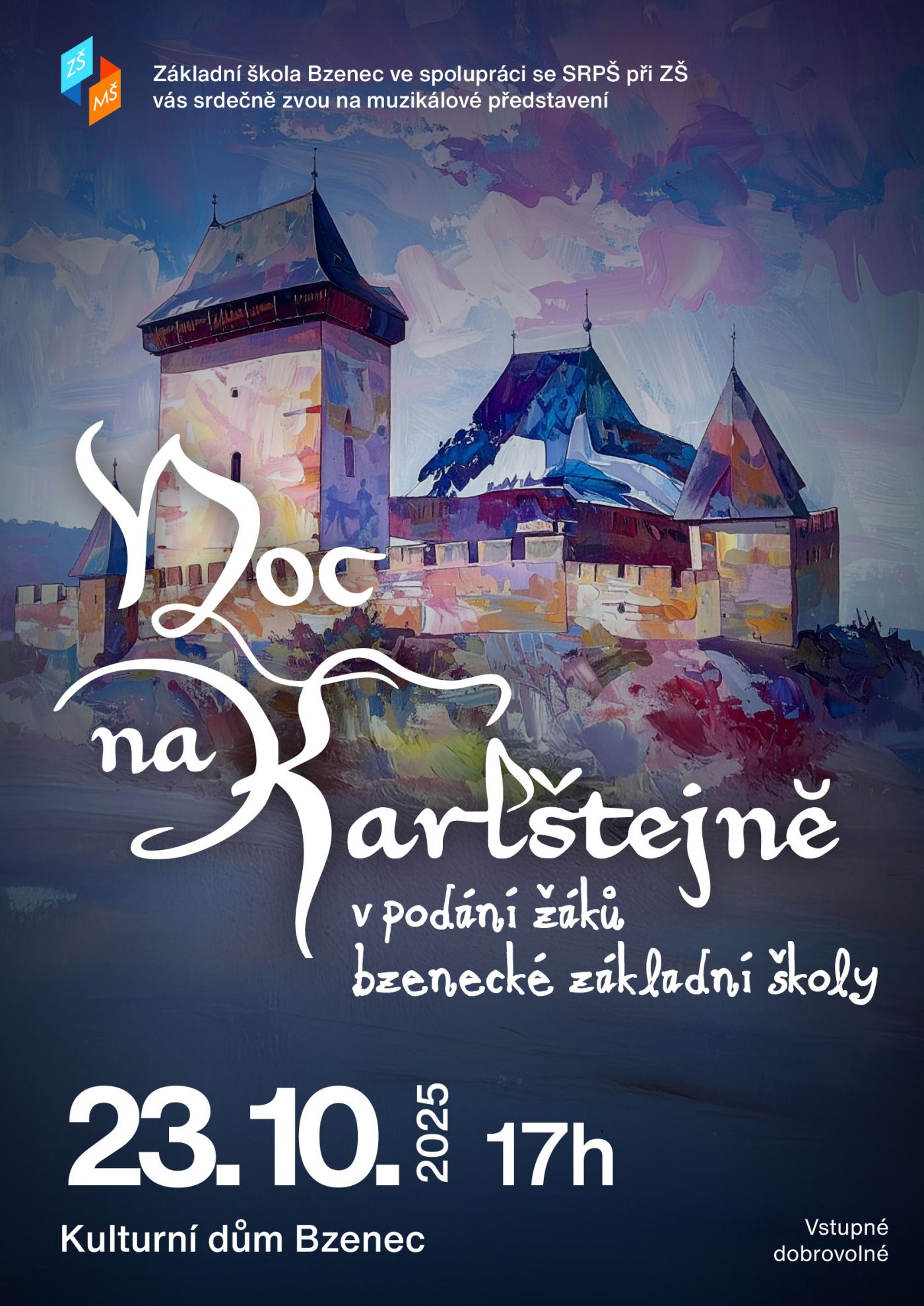 Noc na Karlštejně Kulturní akce 23.10.2025 Lokace: kulturní dům Bzenec v podání žáků základní školyZačátek v 17:00 hod.ZŠ a MŠ Bzenec Přidat do kalendáře