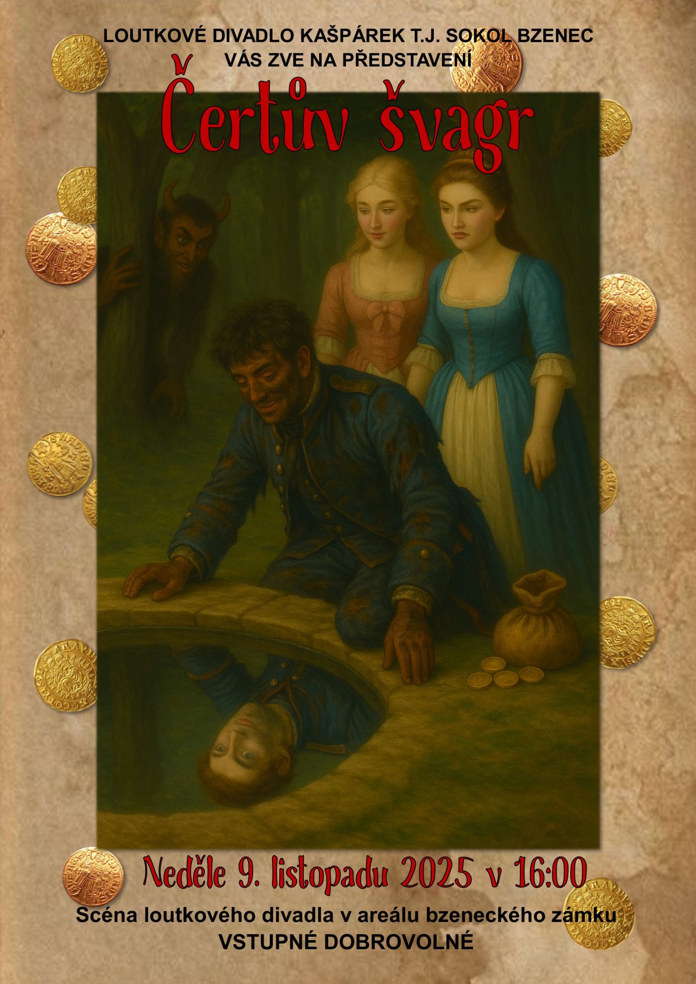 Čertův švagr Pro děti 9.11.2025 Začátek: v 16:00 hod.Scéna loutkového divadla v areálu bzeneckého zámku.Vstupné dobrovolné. Přidat do kalendáře