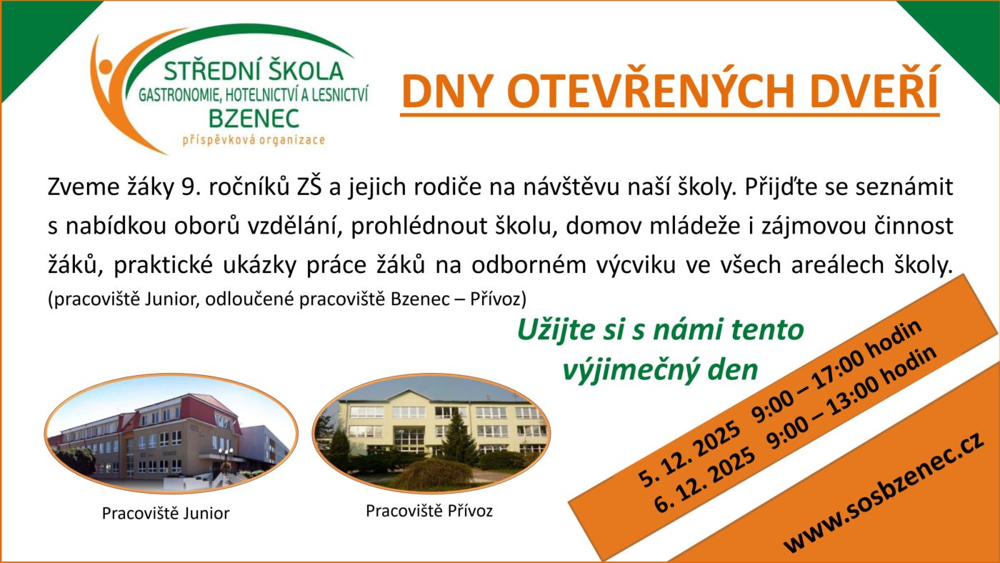 Zveme žáky 9. ročníků ZŠ a jejich rodiče na návštěvu naší školy. Přijďte se seznámit s nabídkou oborů vzdělání, prohlédnout školu, domov mládeže i zájmovou činnost žáků, praktické ukázky práce žáků na odborném výcviku ve všech areálech školy.