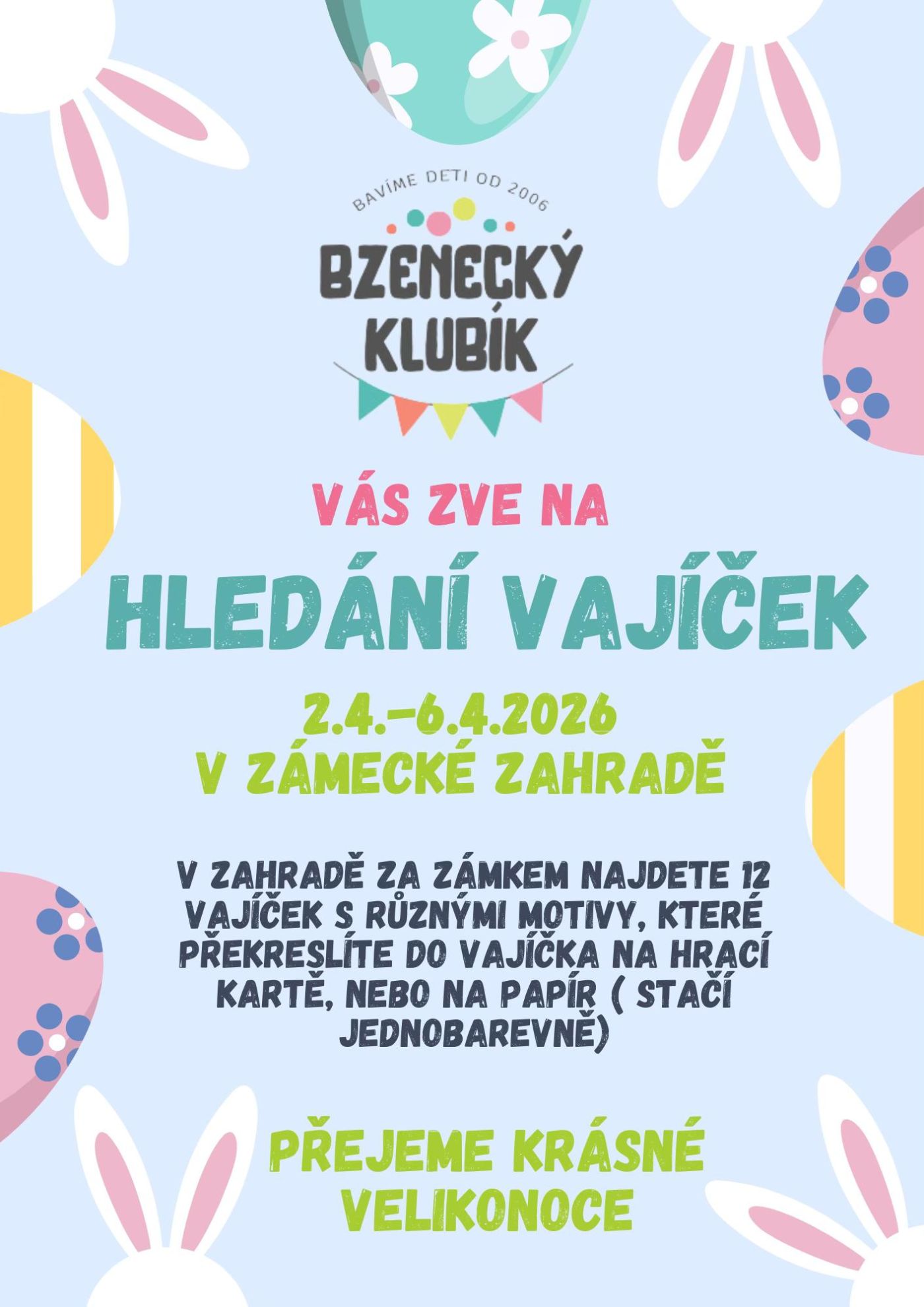 v zahradě za zámkem najdete 12 vajíček s různými motivy, které překreslíte do vajíčka na hrací kartě nebo na papír (stačí jednobarevně)