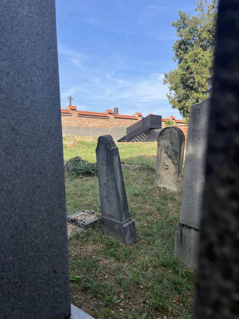 Na rozhraní městského a židovského hřbitova se nově ukrývá drobná realizace schodiště, které jsme zrealizovali pro propojení obou hřbitovů a lepší zpřístupnění toho židovského.
