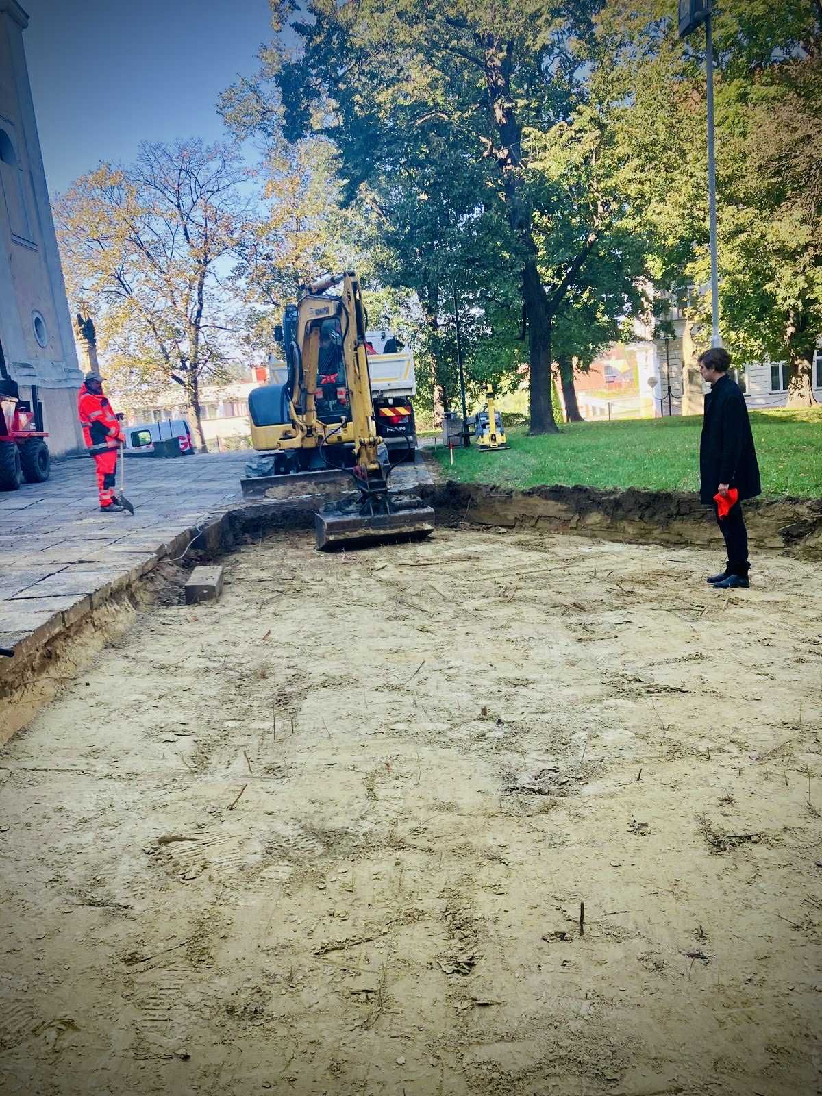 Zde probíhají zemní práce pro souvrství nových dlážděných ploch předprostoru i chodníků. Součástí rekonstrukce je i výměna stávajícího betonového schodiště za pískovcové. Hotovo by mělo být do dvou měsíců, omlouváme se za omezení pohybu na návrší.