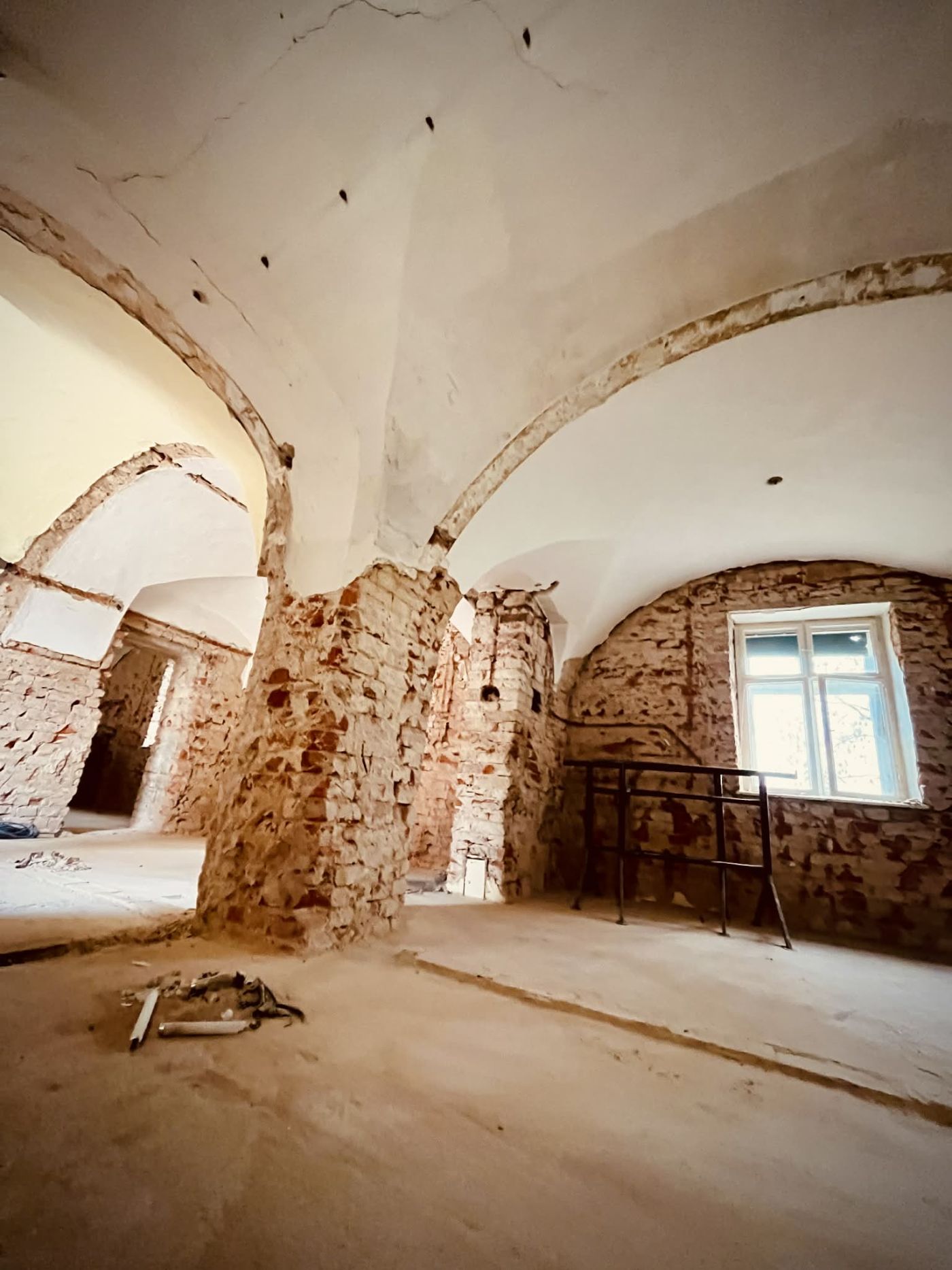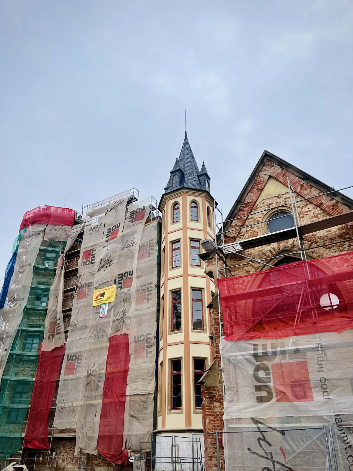 Kromě hlavní budovy se již lešením obklopuje i lisovna. Zhotovitel tak zahájí odstraňování starých omítek a nesoudržných částí zdiva.